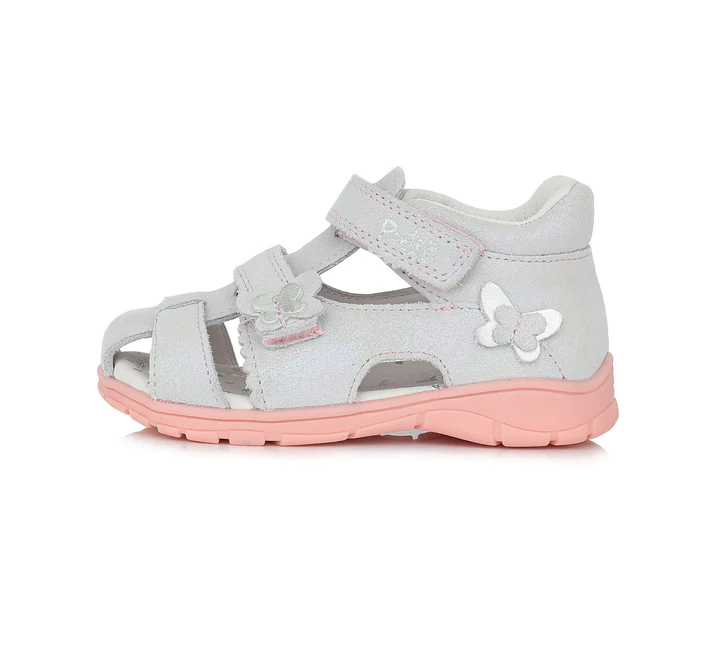 Letní celokožené sandálky, barva perleťově světle šedá, aplikace motýlků, zapínání na dva suché zipy, pevná pata, stélka s podporou pro klenbu, ohebná podrážka.