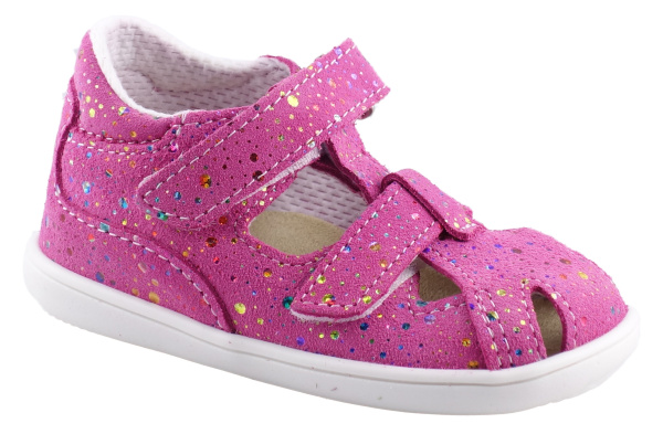Letní kotníčkové sandálky, barva sytě růžová, třpytivý potisk, svrchní materiál kůže, uvnitř textil včetně vytahovací stélky s podporou klenbu. Zapínání na dva suché zipy, ohebná podrážka.