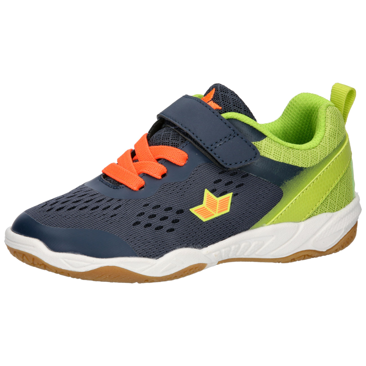 Sálová obuv, barva tmavě modrá v kombinaci s reflexní zelenou a oranžovou, svrchní materiál syntetika a textil, uvnitř textil, zapínání na jeden suchý zip, falešná gumička.