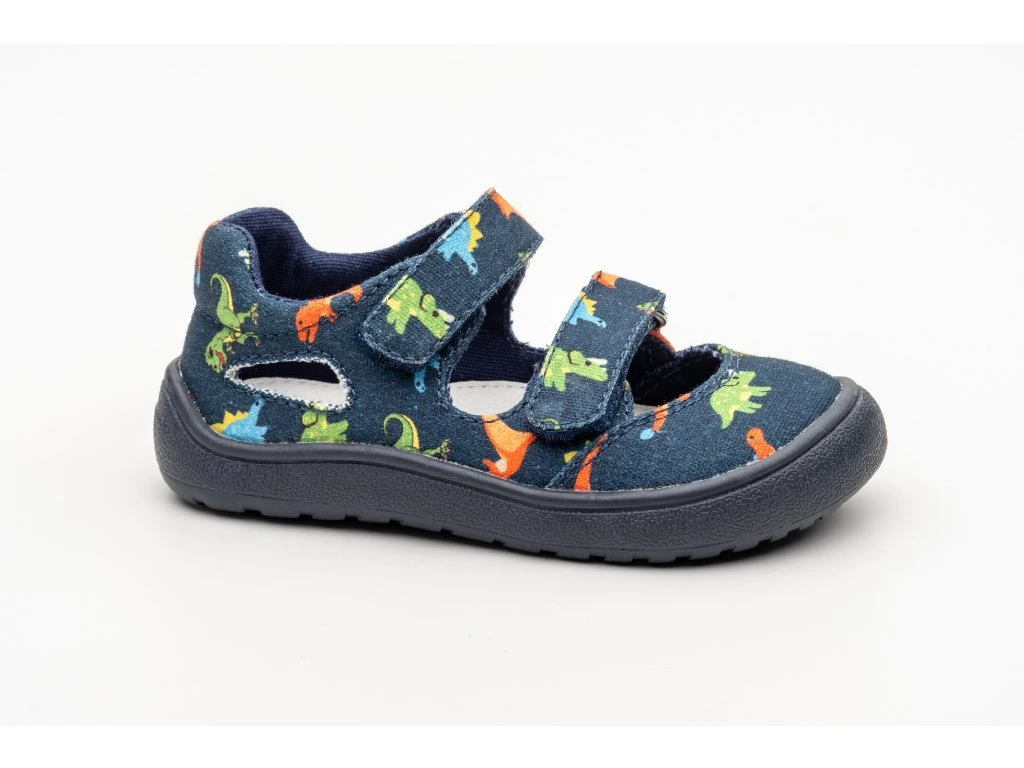 Textilní barefoot sandálky, barva tmavě modrá, potisk dinosaurů, zapínání na dva suché zipy, kožená vytahovací stélka, uvnitř textil.