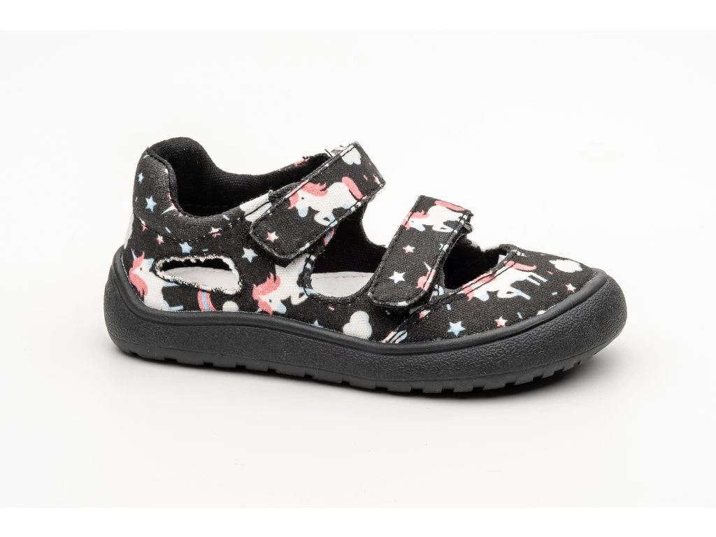 Textilní barefoot sandálky, barva černá, potisk jednorožců, zapínání na dva suché zipy, kožená vytahovací stélka, uvnitř textil.