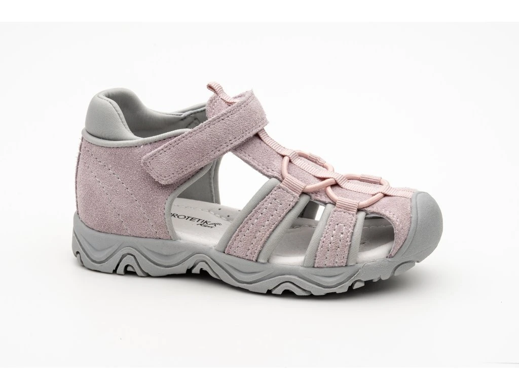 Tvar této boty napomáhá správnému vývoji chodidla. Použité atestované přírodní materiály zabezpečují zdravotní nezávadnost obuvi. Barva světle fialová v kombinaci s šedou. Svrchní materiál kůže a textil. Uvnitř textil, kožená zdravotní stélka s podporou klenby. Boty jsou vhodné i pro vyšší nárt. Zapínání na jeden suchý zip. Pevná plná pata. Špice je chráněna proti okopu. Ohebná podrážka.