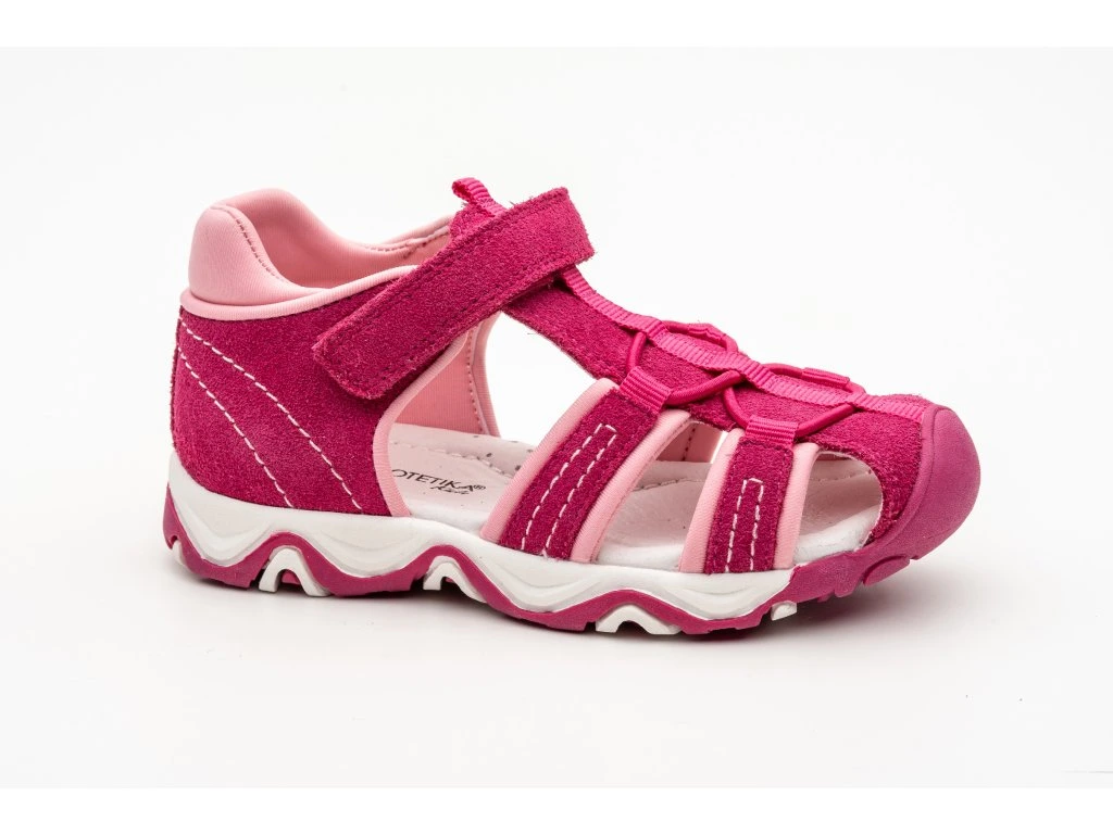 Tvar této boty napomáhá správnému vývoji chodidla. Použité atestované přírodní materiály zabezpečují zdravotní nezávadnost obuvi. Barva sytě malinová v kombinaci s růžovou. Svrchní materiál kůže a textil. Uvnitř textil, kožená zdravotní stélka s podporou klenby. Boty jsou vhodné i pro vyšší nárt. Zapínání na jeden suchý zip. Pevná plná pata. Špice je chráněna proti okopu. Ohebná podrážka.