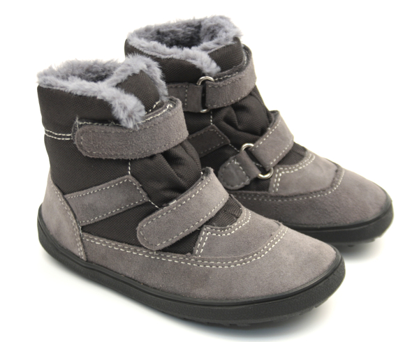 Zimní BAREFOOT boty, voděodolná membrána, barva šedá v kombinaci s černou, svrchní materiál kůže a textil, uvntř kožíšek.