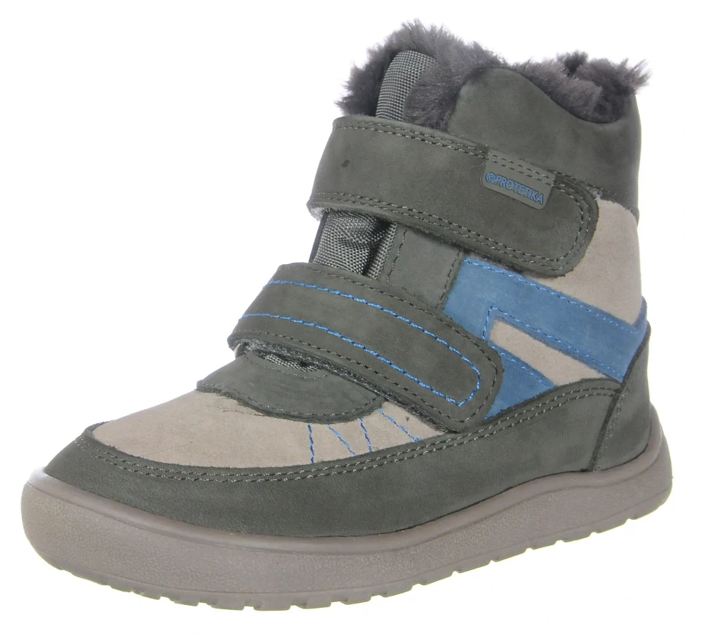 Zimní BAREFOOT boty, membrána PRO-TEX, všitý jazyk, barva tmavě šedá v kombinaci se světle šedou a modrou, svrchní materiál kůže a textil, uvnitř kožíšek, flísová vytahovací stélka, zapínanání na dva suché zipy. Ohebná podrážka.