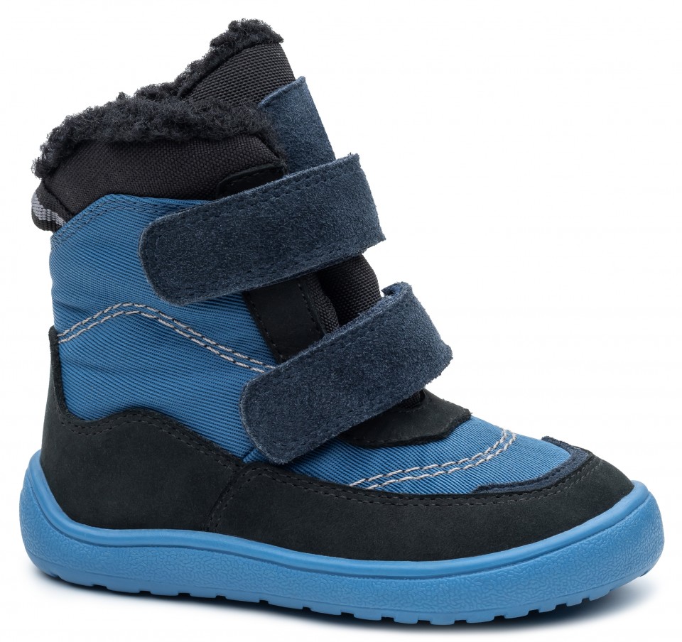 Zimní BAREFOOT boty, membrána PRO-TEX, všitý jazyk, barva černá v kombinaci s modrou, svrchní materiál kůže a textil, uvnitř kožíšek, flísová vytahovací stélka, zapínanání na dva suché zipy. Ohebná podrážka.