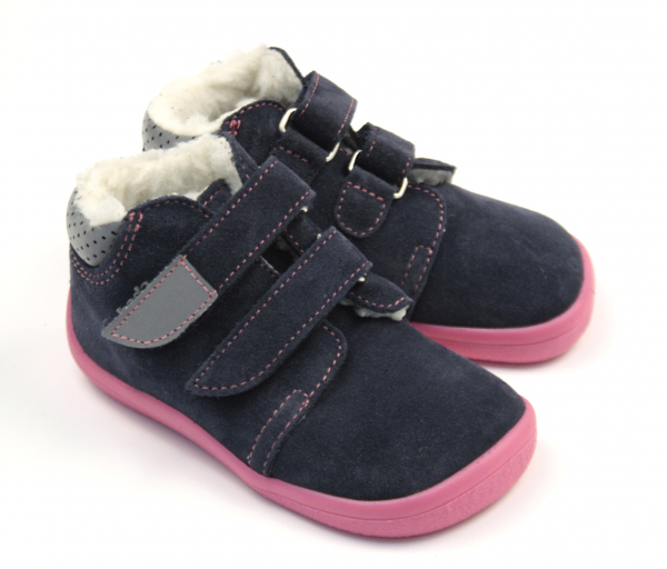 Zimní kotníčkové BAREFOOT boty s membránou TE-POR, barva tmavě modrá v kombinaci s malinovou, svrchní materiál kůže, uvnitř kožíšek, zapínání na dva suché zipy, široká špice, ohebná flexibilní podrážka, pevnější opatek, vytahovací zateplená stélka, reflexní prvky. Balení obsahuje i stélky navíc.
