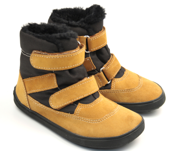 Zimní BAREFOOT boty, voděodolná membrána, barva hořčicová v kombinaci s černou, svrchní materiál kůže a textil, uvntř kožíšek.