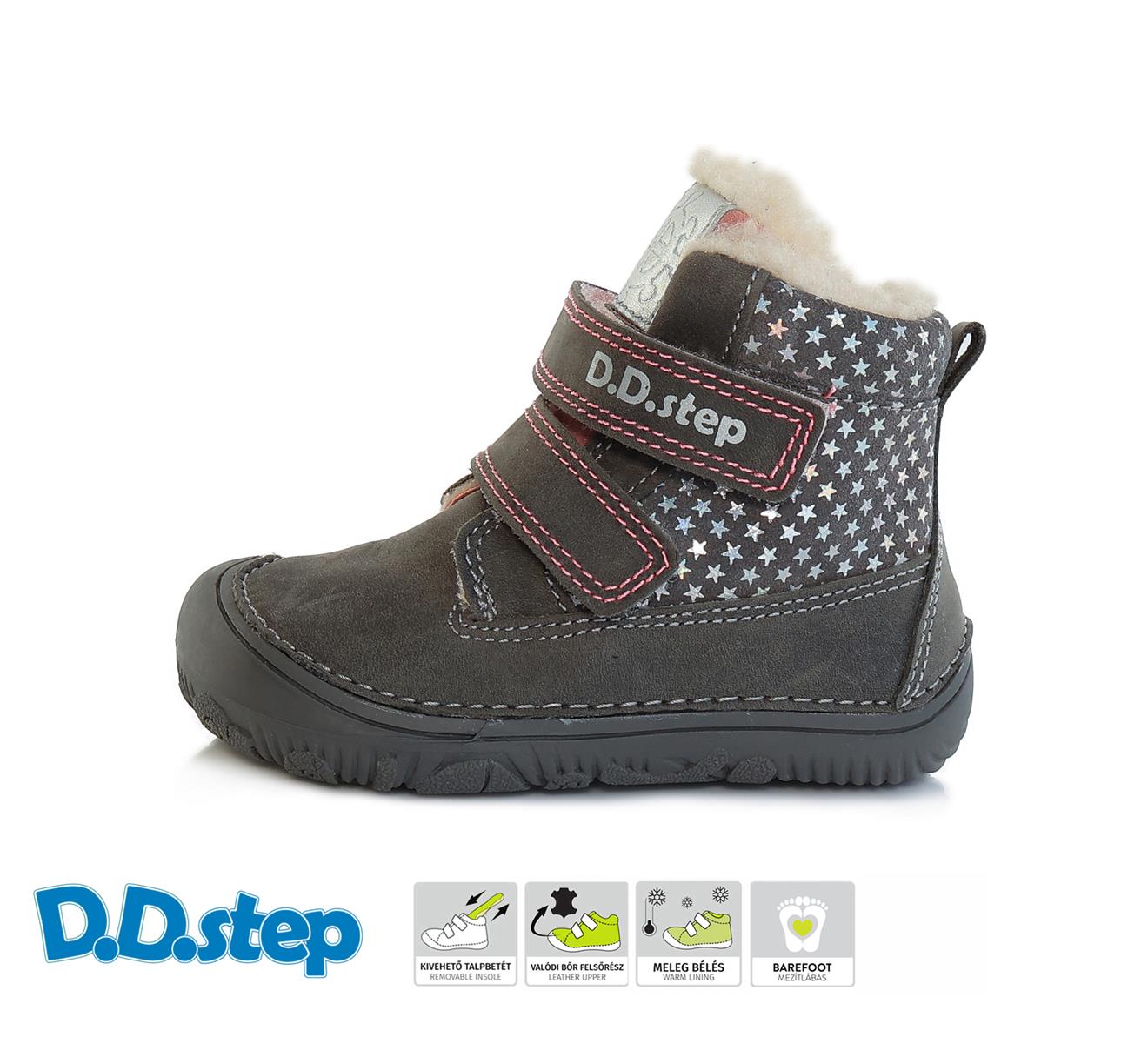 Zimní BAREFOOT boty, barva šedohnědá v kombinaci se stříbrnou a růžovou, potisk hvězdiček, zapínání na dva suché zipy, svrchní materiál kůže, uvnitř kožíšek, vytahovací zateplená stélka, ohebná podrážka.