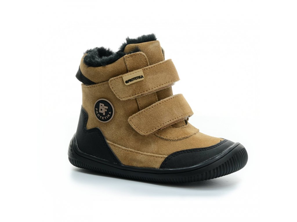 Zimní barefoot boty, barva hnědá v kombinaci s černou, svrchní materiál kůže a syntetika, zapínání na dva suché zipy, uvnitř kožíšek, flísová vytahovací stélka, ohebná podrážka.