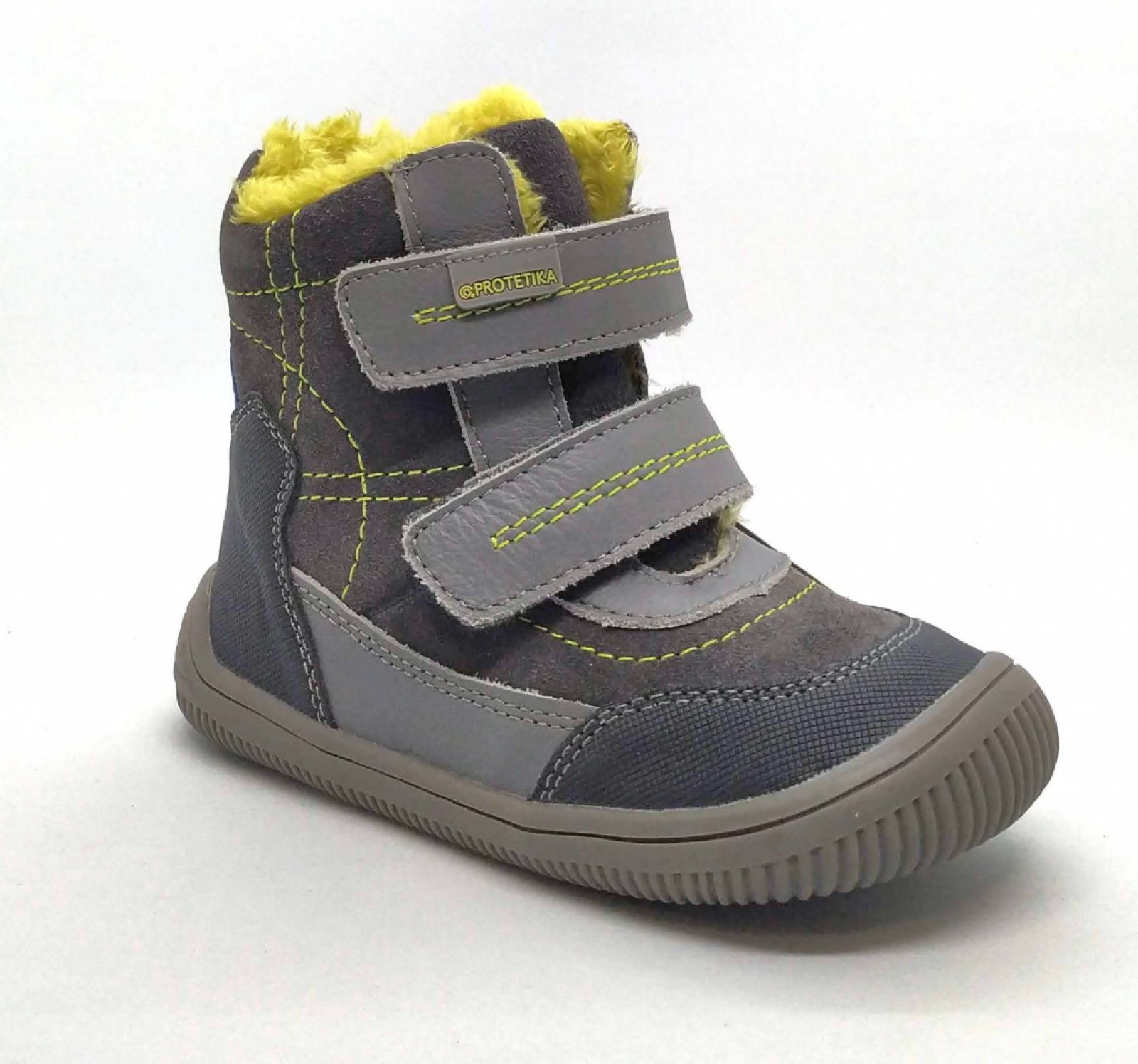 Zimní barefoot boty, barva šedá v kombinaci se zelenou a modrou, svrchní materiál kůže a syntetika, zapínání na dva suché zipy, uvnitř kožíšek, flísová vytahovací stélka, ohebná podrážka.