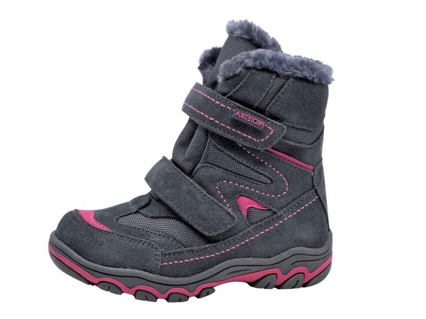 Tvar obuvi podporuje správný vývoj chodidla Vašeho dítěte. Použité atestované přírodní materiály zabezpečují zdravotní nezávadnost obuvi. Zimní boty s membránou PRO-tex, barva tmavě šedá v kombinaci s malinovou, svrchní materiál kůže a tvrzený textil, všitý jazyk, zapínání na dva suché zipy, uvnitř teplý kožíšek, zateplená vytahovací stélka s podporou pro klenbu. Pevná pata.