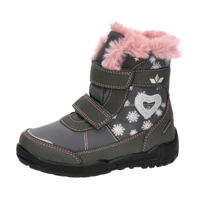 Zimní boty s membránou Comfortex, barva šedá v kombinaci se starorůžovou a stříbrnou, aplikace srdíčka a potisk vloček, zapínání na dva suché zipy, všitý jazyk, uvnitř kožíšek, svrchní materiál syntetika, ohebná podrážka, vytahovací stélka. Reflexní prvky.
