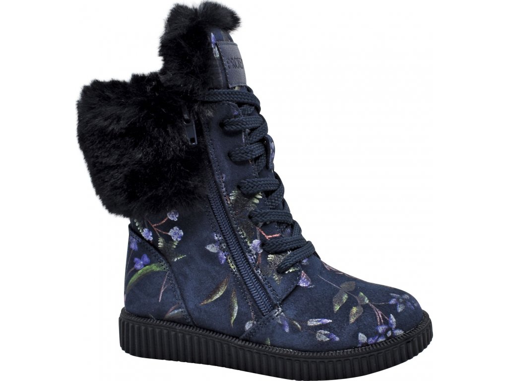 Tvar obuvi podporuje správný vývoj chodidla Vašeho dítěte. Použité atestované přírodní materiály zabezpečují zdravotní nezávadnost obuvi. Zimní boty, barva tmavě modrá, potisk kytiček, svrchní materiál kůže, šněrování-na obou stranách zipy, takže se velice dobře obouvají, uvnitř hřejivý huňatý kožíšek, zateplená vytahovací stélka s podporou pro klenbu. Pevná pata, ohebná podrážka.