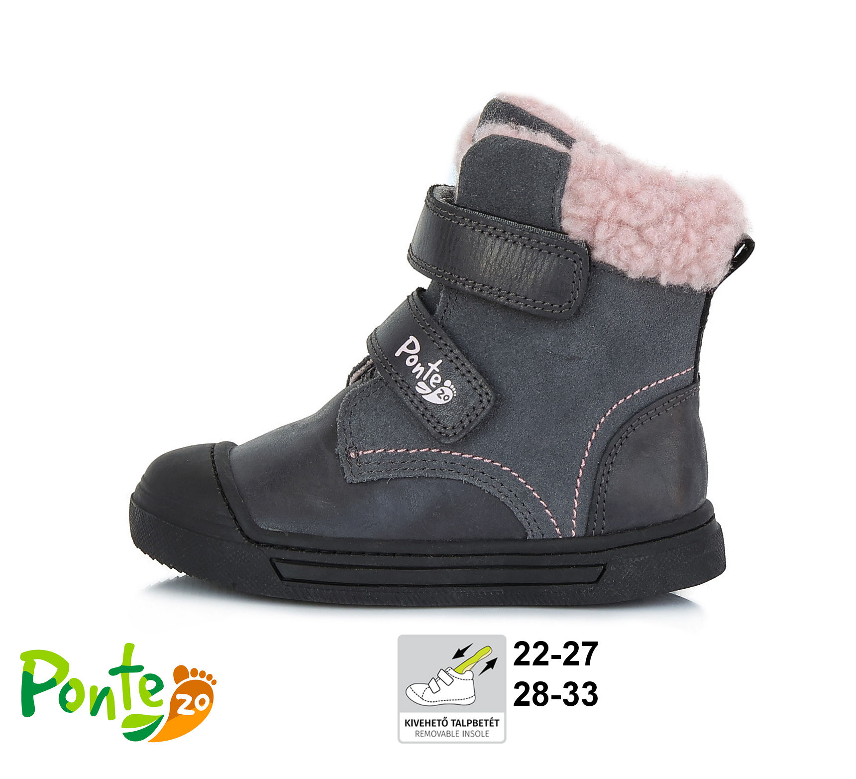 Zimní boty, barva šedá v kombinaci se starorůžovou, zapínání na dva suché zipy, svrchní materiál kůže, všitý jazyk, uvnitř kožíšek, vytahovací zateplená stélka, pevná pata, špice chráněna proti okopu.